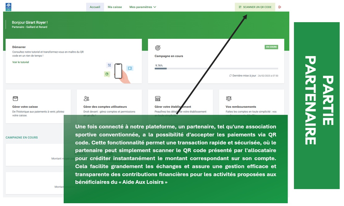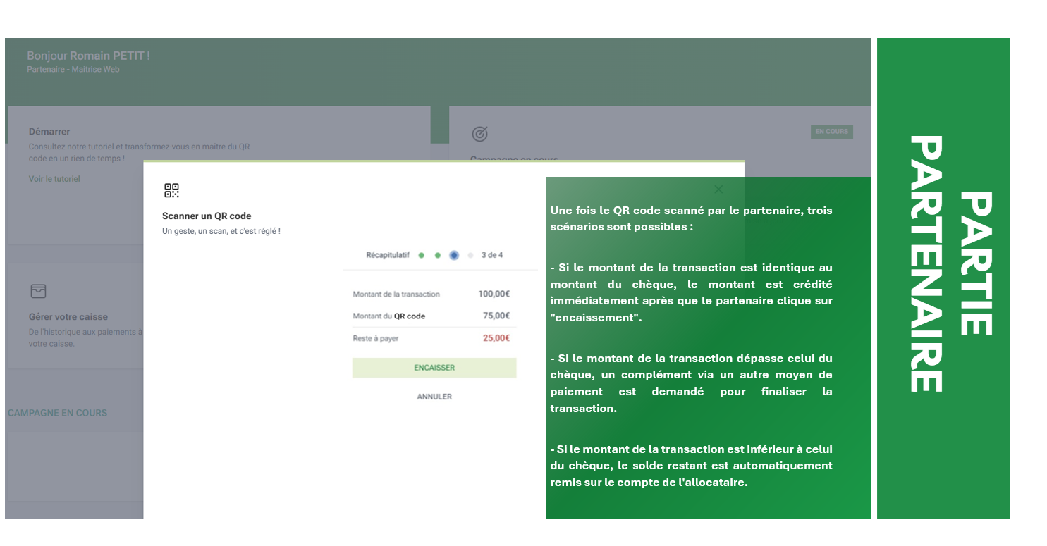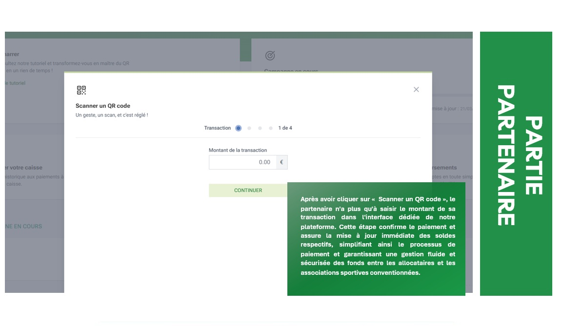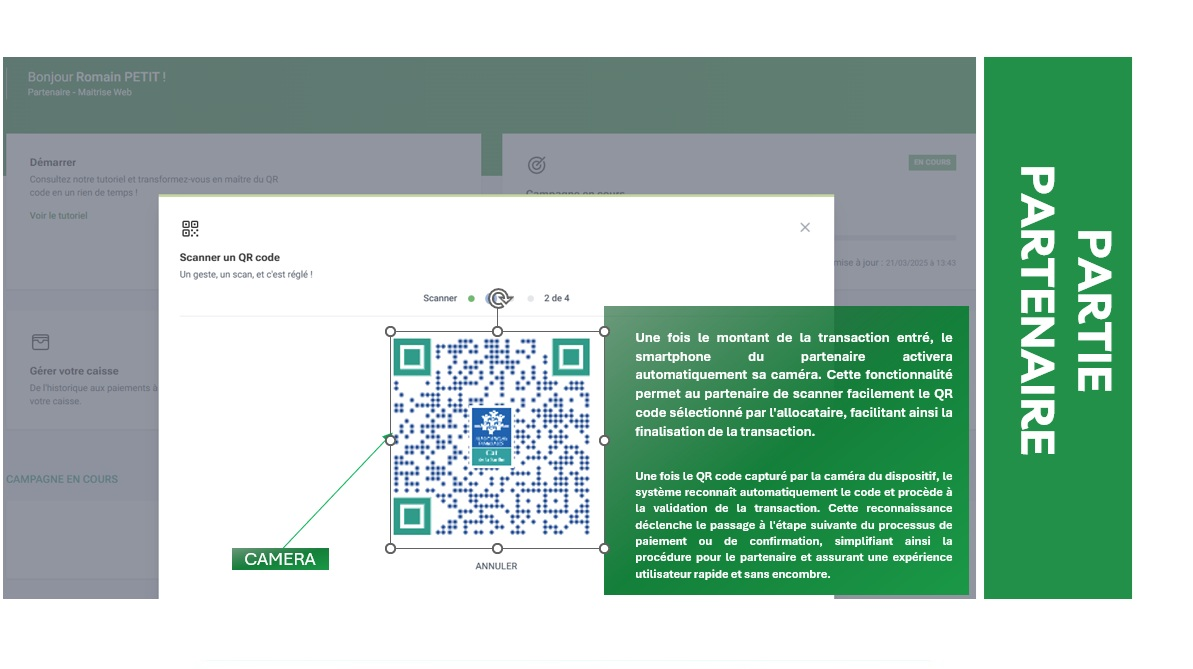 Grâce à votre compte partenaire, vous pouvez scanner ces QR codes, indiquer le montant de votre prestation de service et visualiser les restes à payer éventuels.